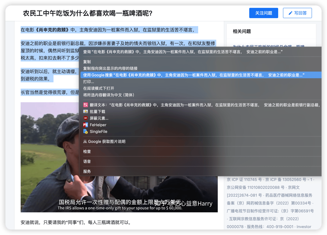 最近看到一篇关于工人为什么喜欢在午饭时喝一瓶啤酒的讨论帖,网友在回复中提到《肖生克的救赎》的片段,我想复制出来作为模板发给Gemini,让Gemini用同样的口吻总结出更多电影中的经典片段。但是原网站限制了右键复制,所以就有了这篇文章