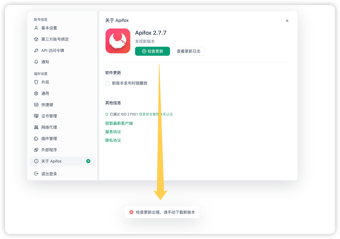 删除更新目录以后,Apifox再自动更新的时候检测到目录不存在,会再次自动创建目录,所以还需要手动创建一个同名的文件,让Apifox无法正常写入新版本的安装包