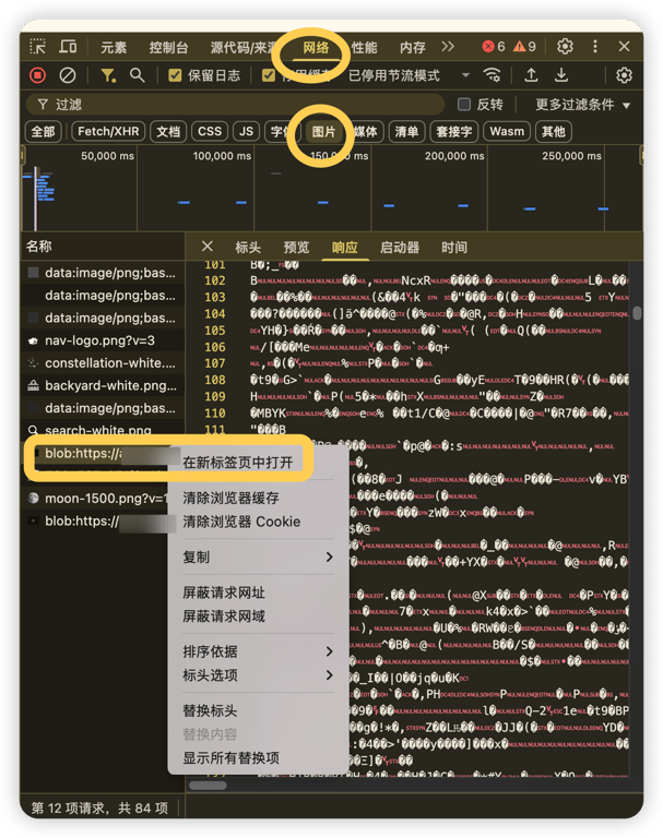 2.使用Chrome开发者工具查看图片网络请求,右键新标签打开需要下载的blob协议的图片