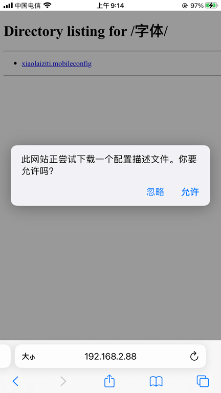 iPhone使用safari浏览器访问macOS设备在局域网的网页服务地址,进入字体描述文件所在的目录并下载:访问地址即你的「macOS设备在局域网的ip地址:端口号」,例如192.168.2.88:8000