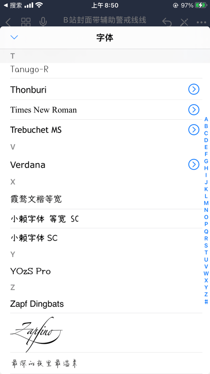 iOS设备启动一个支持切换自定义字体的app查看效果,例如我用来制作视频封面的GoodNotes。这里需要说明的是ios系统在未越狱的状态下是不允许修改系统字体的,仅部分笔记与设计类的app能够实现字体的替换,这是ios系统的局限性所致