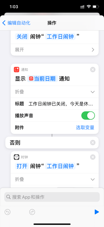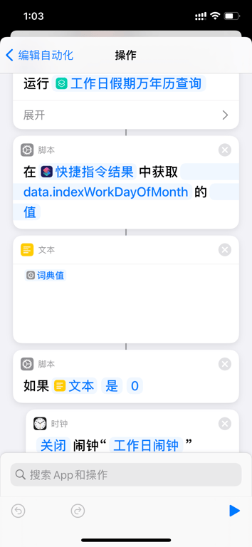 使用iOS快捷指令请求API接口,查询每天的万年历,自动切换当天的闹钟开关。解决2个问题:1.当周末也要补班时,自动打开闹钟 2.当周一到周五的工作日放假时,自动关闭闹钟